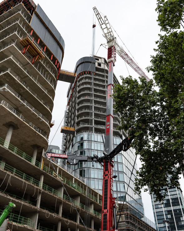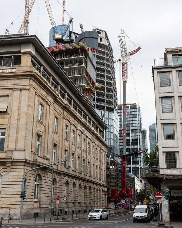 Eine visionäre Stadtlandschaft in Frankfurt, wo Leben, Wohnen und Arbeiten in perfekter Harmonie verschmelzen
