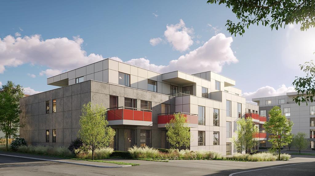 Das architektonische Design der Gebäude kombiniert zeitgenössische Ästhetik mit funktionalen Elementen, um eine ansprechende und lebenswerte Umgebung zu schaffen. Jede Wohneinheit wird sorgfältig gestaltet, um höchsten Wohnkomfort zu bieten.